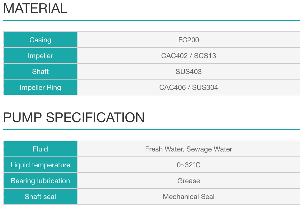 The dry type motor used for this pump is specially designed for submersible application. Double Mechanical seals are employed to prevent water from flooding the motor. To ensure absolute safety In operation, leakage and thermal detectors can be added.
